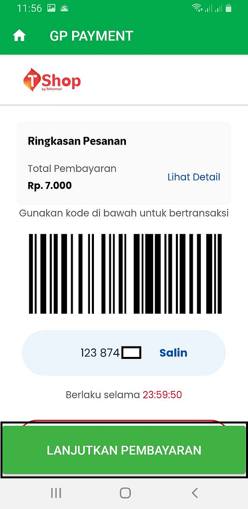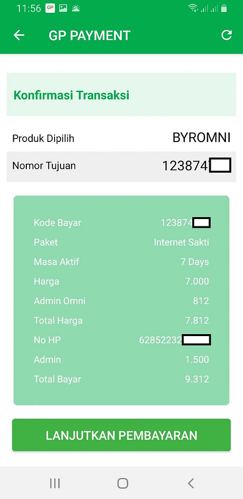 7. Kamu akan diarahkan ke halaman pengecekan kode bayar di aplikasi GP PAYMENT berisi rincian pembayaran kamu. Jika setuju lanjutkan pembayaran.