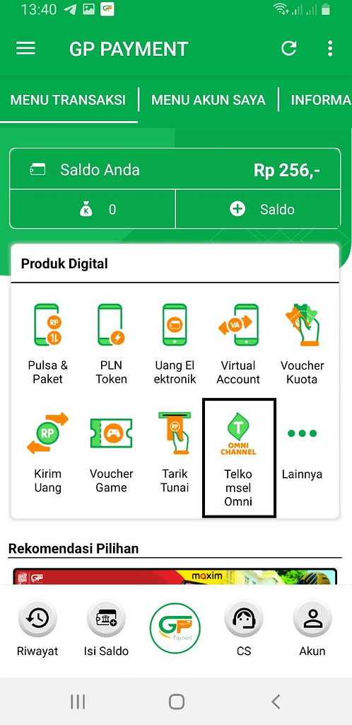 Berikut langkah-langkah pembelian Telkomsel Omni Channel melalui aplikasi GP PAYMENT :