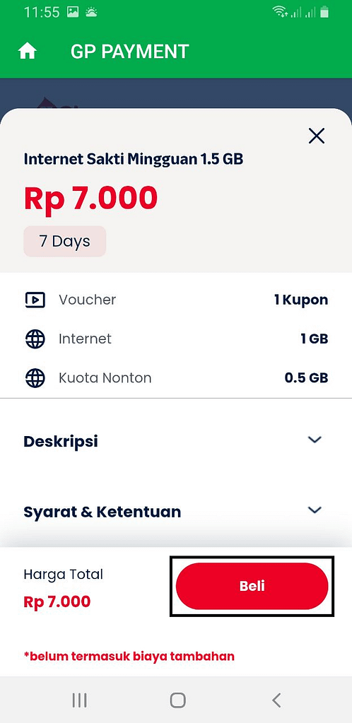 4. Setelah produk dipilih, akan muncul halaman konfirmasi berisi rincian paket internet yang dipilih beserta harga (harga belum termasuk admin omni channel, admin aplikasi serta jasa outlet). Kemudian klik beli.