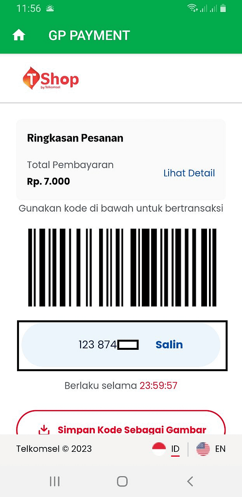 5. Akan muncul halaman pembelian berupa harga (harga belum termasuk admin omni channel, admin aplikasi serta jasa outlet), barcode, kode bayar serta masa berlaku kode bayar. Klik salin.