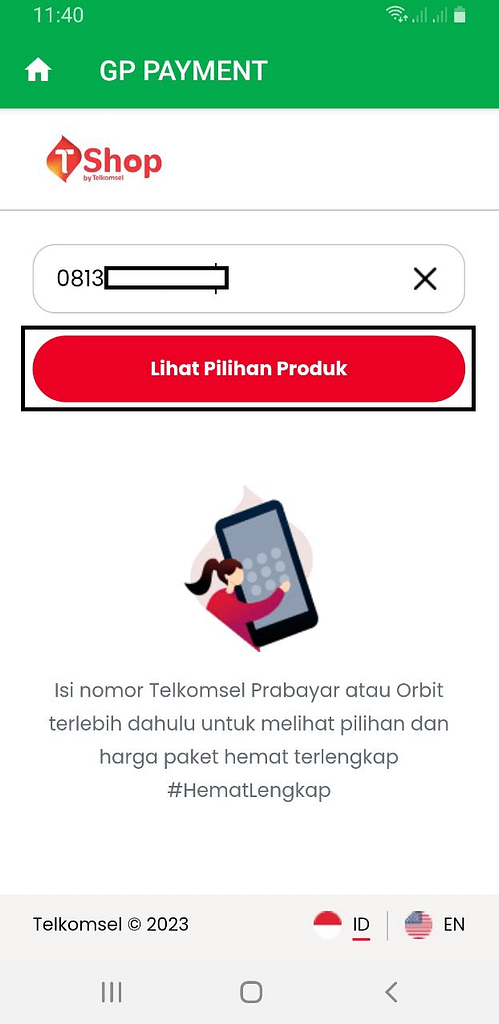 2. Masukan nomor yang akan diisi paket internet, kemudian klik ‘Lihat Pilihan Produk’