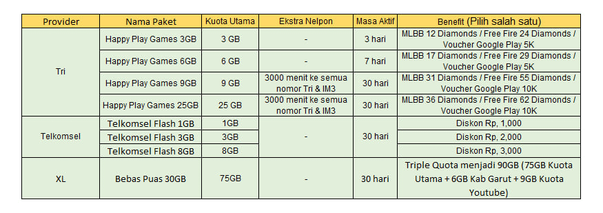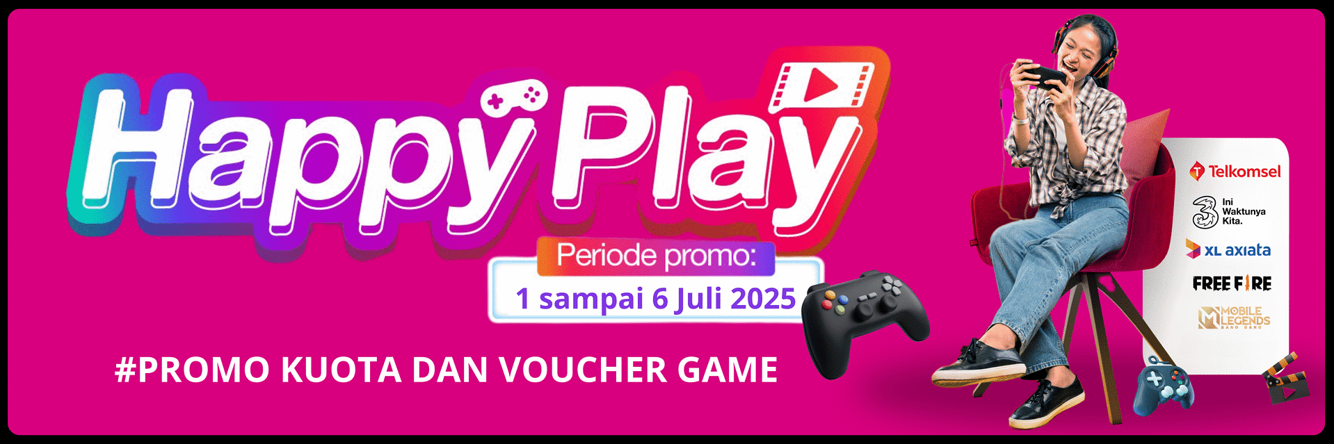 HAPPY PLAY GAMES & INTERNET adalah program promo dari GP PAYMENT yang menawarkan diskon paket untuk paket Internet Telkomsel, XL dan Tri, serta diskon pembelian produk voucher game Free Fire. Selain itu khsusu pelanggan setia Tri, kami juga menawarkan paket data bundling voucher game beserta benefit lainnya. Dengan rincian sebagai berikut: