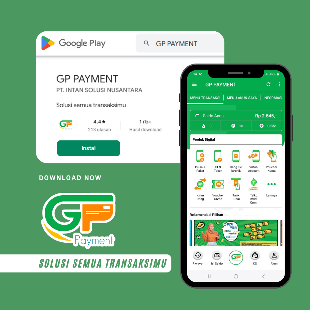 Aplikasi android GP PAYMENT adalah aplikasi mobile gratis untuk pengguna setia kami yang berpusat di lokal maupun nasional. Aplikasi ini memudahkan Anda dalam melakukan berbagai transaksi seperti pengisian pulsa, pembelian token listrik, pembayaran tagihan pasca bayar, pembelian voucher game, dll.